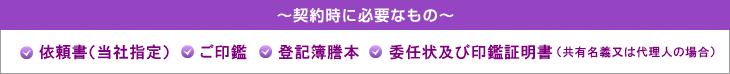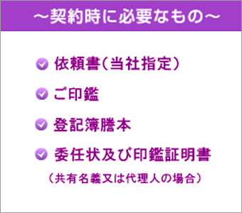 弊社のサービス内容をご理解し、契約をご了解いただけましたら、賃貸管理業務委託契約を結んでいただきます。まずは、査定賃料を参考にして募集賃料を決定し、弊社担当者までお申込ください。ご契約の際には、募集賃料のほかに、契約コース、契約期間、ご入居中の場合には退去日などもご決定いただきます。主な必要書類は、以下の通りです。